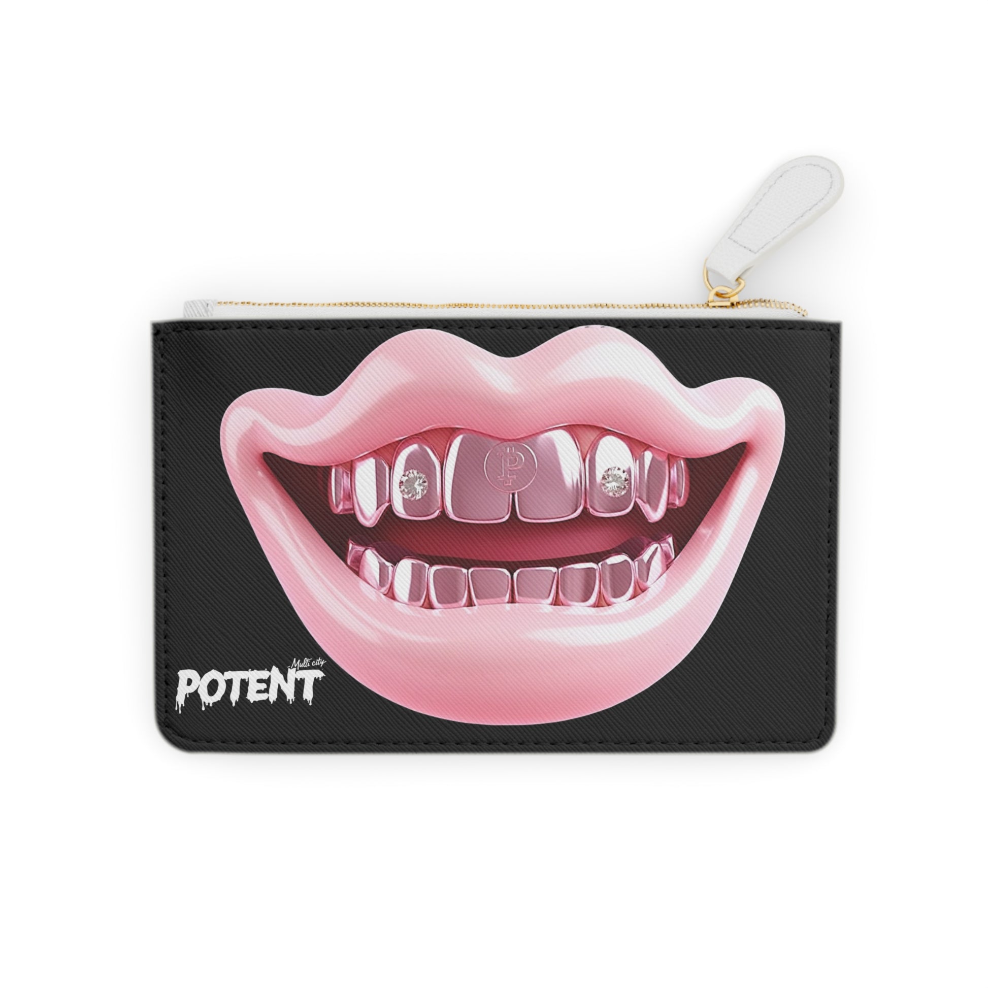 This mini clutch bag brings bold, playful attitude to everyday carry. Made from cruelty-free Saffiano faux leather, it features double-sided, high-definition prints — glossy lips and jewel-like teeth on a deep-black canvas — that hold their vibrant color over time. The gold-colored metal zipper and pull add a luxe pop, while the compact interior and handy pocket fit a cardholder, keys, and a few small essentials. Lightweight and easy to slide into a larger bag or carry on its own, it’s for people who love striking, art-forward accessories that start conversations.